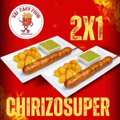 Súper chorizos de pollo especial con papa criolla y salsa tipo guacamole.