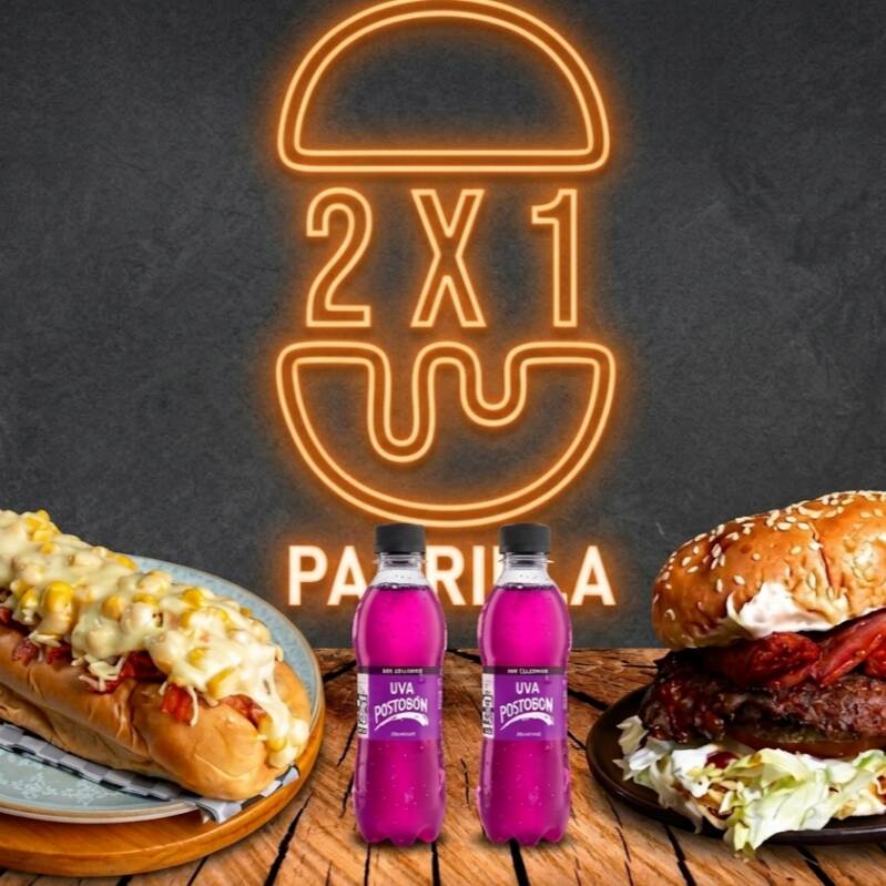 Hamburguesa Ranchera contiene: Carne de res 80 g, pan brioche, tocineta, doble salchicha, queso, ripio de papa, lechuga y tomate con salsa de tomate, salsa de piña y salsa de la casa + Perro caliente contiene: pan brioche, salchicha americana, cebolla en cubos, ripio de papa, queso, maíz dulce, tocineta y salas + 2 gaseosa Postobón 250 ml (sabores según disponibilidad de la tienda)