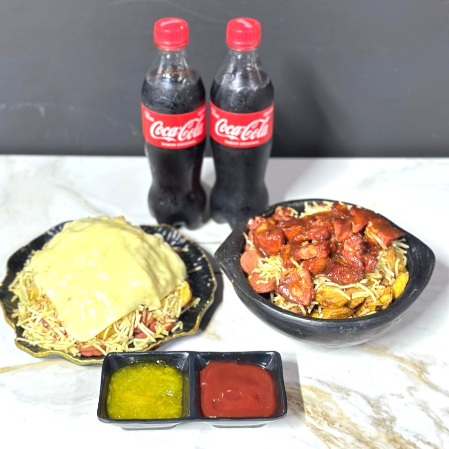 Contiene 2 salchipapas sencillas de papa amarilla, salchicha, ripio de papa y salsas, dos gaseosas Postobón 250 ml, sabor según disponibilidad de la tienda.