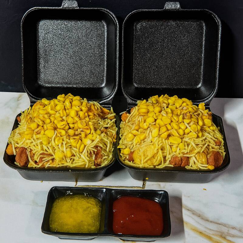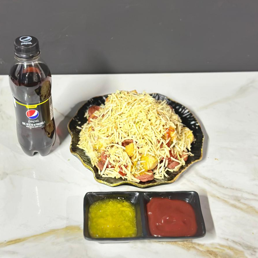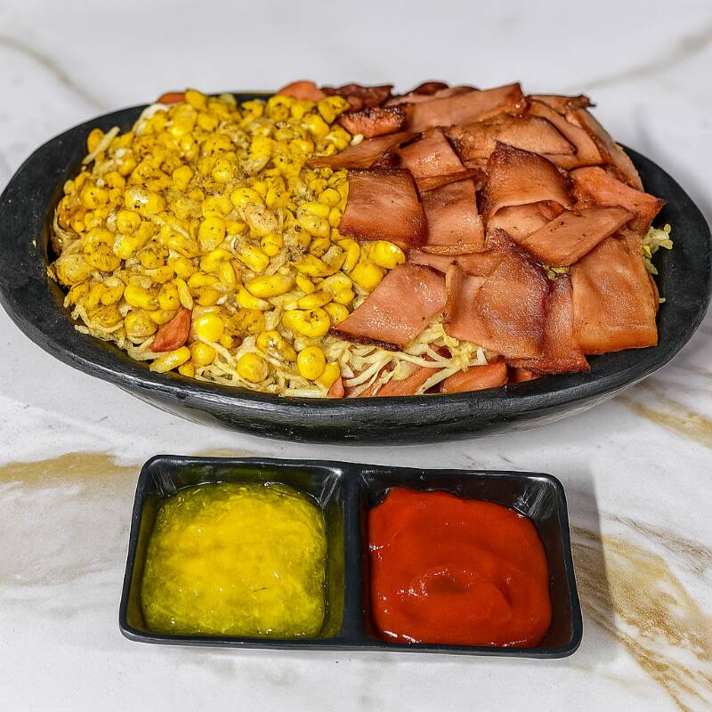 Contiene 2 salchipapas, papa amarilla, salchicha, ripio de papa, queso, maicitos y salsas