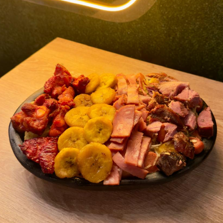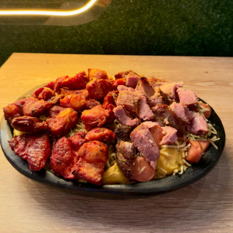 Papa amarilla, salchicha, ripio de papa, 100g carne a la llanera, 100g de costilla ahumada, madurito, tocineta y salsas.