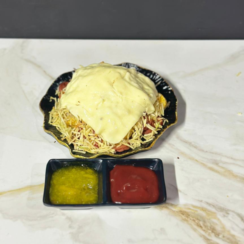 Papa amarilla, salchicha, queso, maduro y ripio de papa.