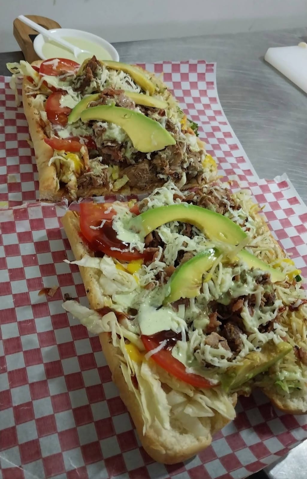 Pan canilla especial de 30cm, lechuga, tomate, ensalada rallada, ripio de papas, cerdo especial Kintsugi, tocineta, aguacate, queso mozzarella y salsas (tomate, BBQ, mostaza y salsa de la casa).
