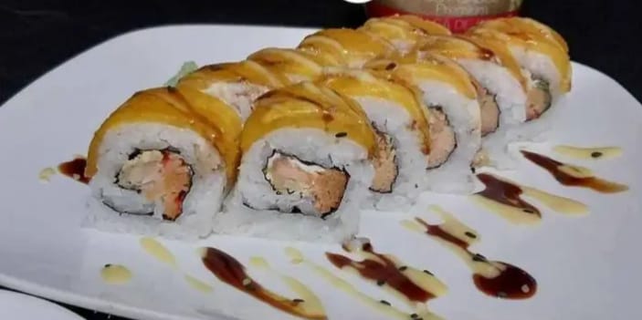 Rollo de sushi, relleno con tilapia, queso crema, cebollín, plátano maduro y aguacate, bañados en salsa Kintsugi.