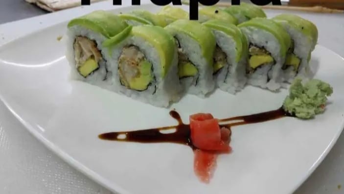 Rollo de sushi clásico en cama de arroz y alga nory, relleno de tilapia tempurizada, queso crema, aguacate, cebollín verde y tope de aguacate.