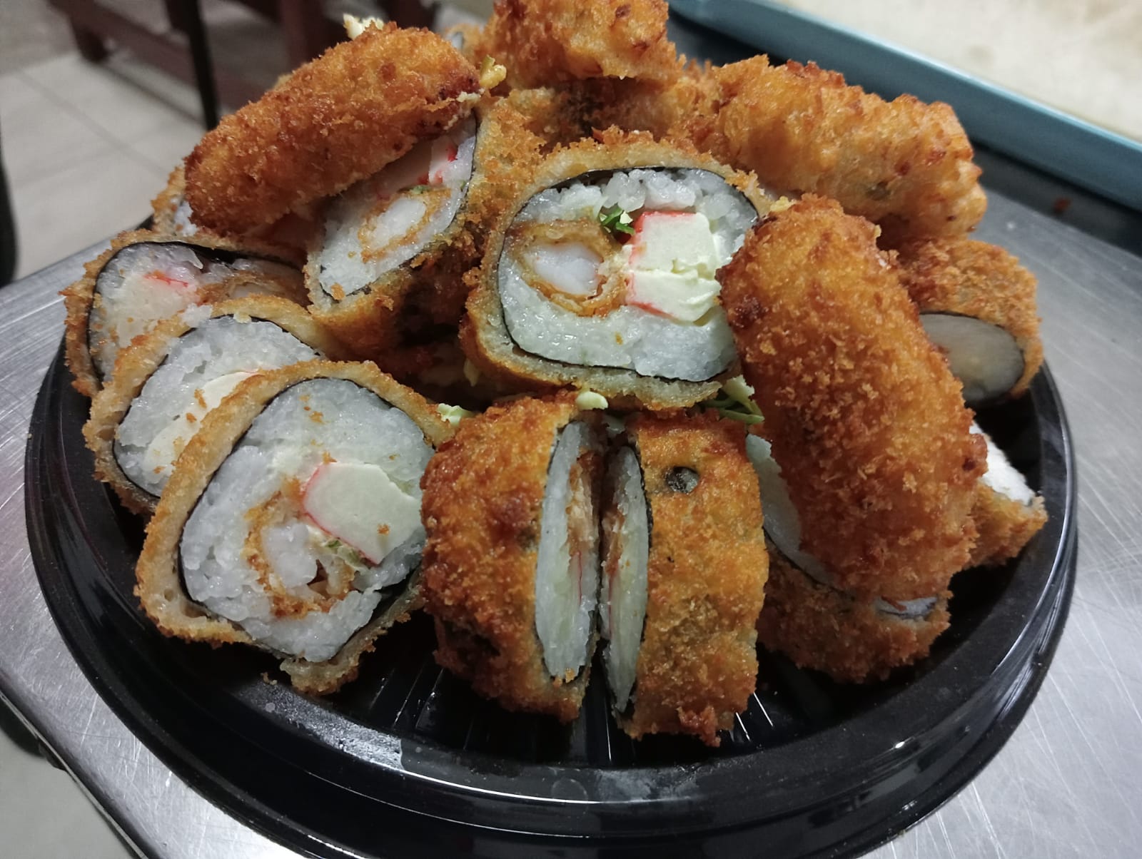 Rollo de sushi especial, en cama de arroz y alga nory, relleno de salmón tempurizado, palmitos de cangrejo, queso crema, tempurizados en panko.