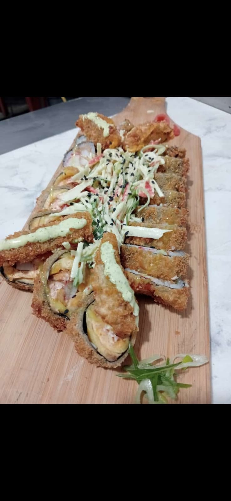 Rollo de sushi especial en cama de arroz y alga nory, relleno de salmón tempurizado, palmitos de cangrejo, queso crema y cebollín verde, con tope de salmón, tilapia, atún, aguacate y plátano maduro.
