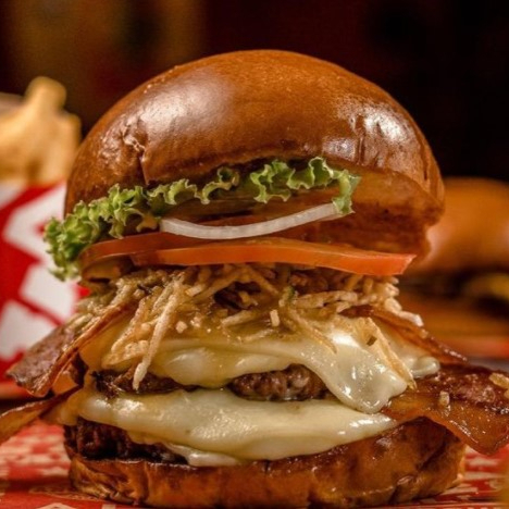 Pan brioche mantequilla, carne 100% Angus res, queso americano, cebolla crispy, salsa de la casa y salsa BBQ.