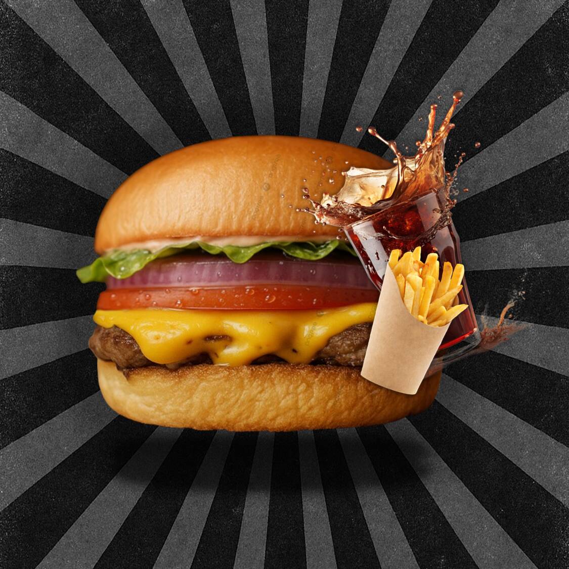 Hamburguesa con 100g de carne al mejor estilo smashburger, queso americano fundido, tomate milano, cebolla morada, lechuga iceberg y Salsa 911 + Papas de 130gr + Gaseosa 400ml