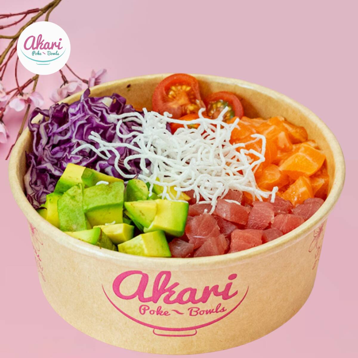 Poke con base a elección + dos proteínas + tres ingredientes + crunch + salsa