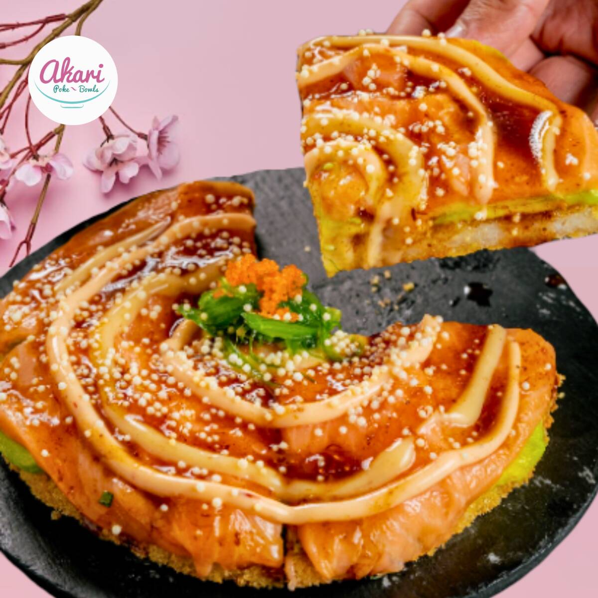 Base de arroz crocante cubierta de una combinación de cubos de salmón, atún y cangrejo, aderezadocon mayonesa japonesa y masago, bañado con salsa teriyaki ymayo-spicy, coronado con ensalada de algas, y semillas desésamo tostadas.