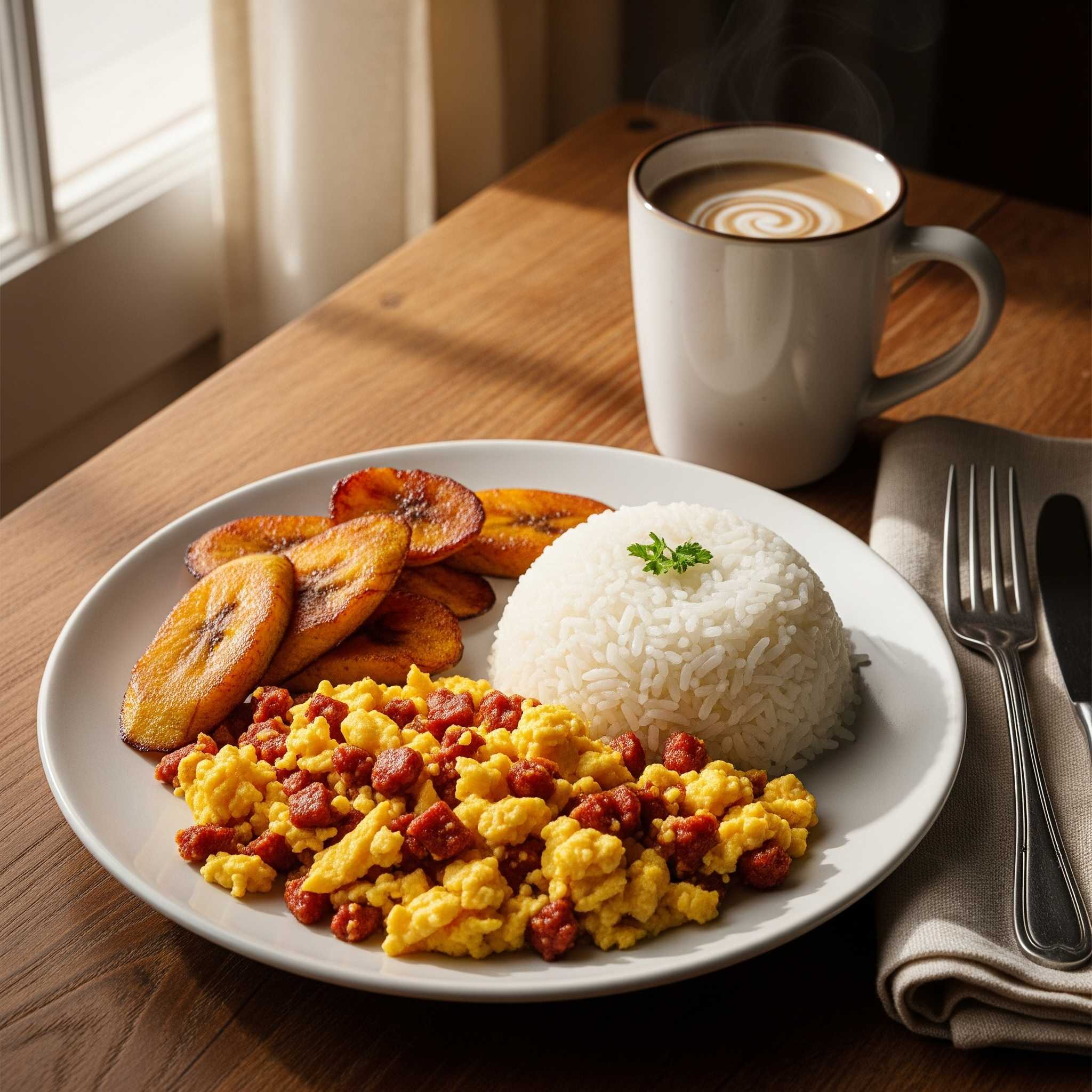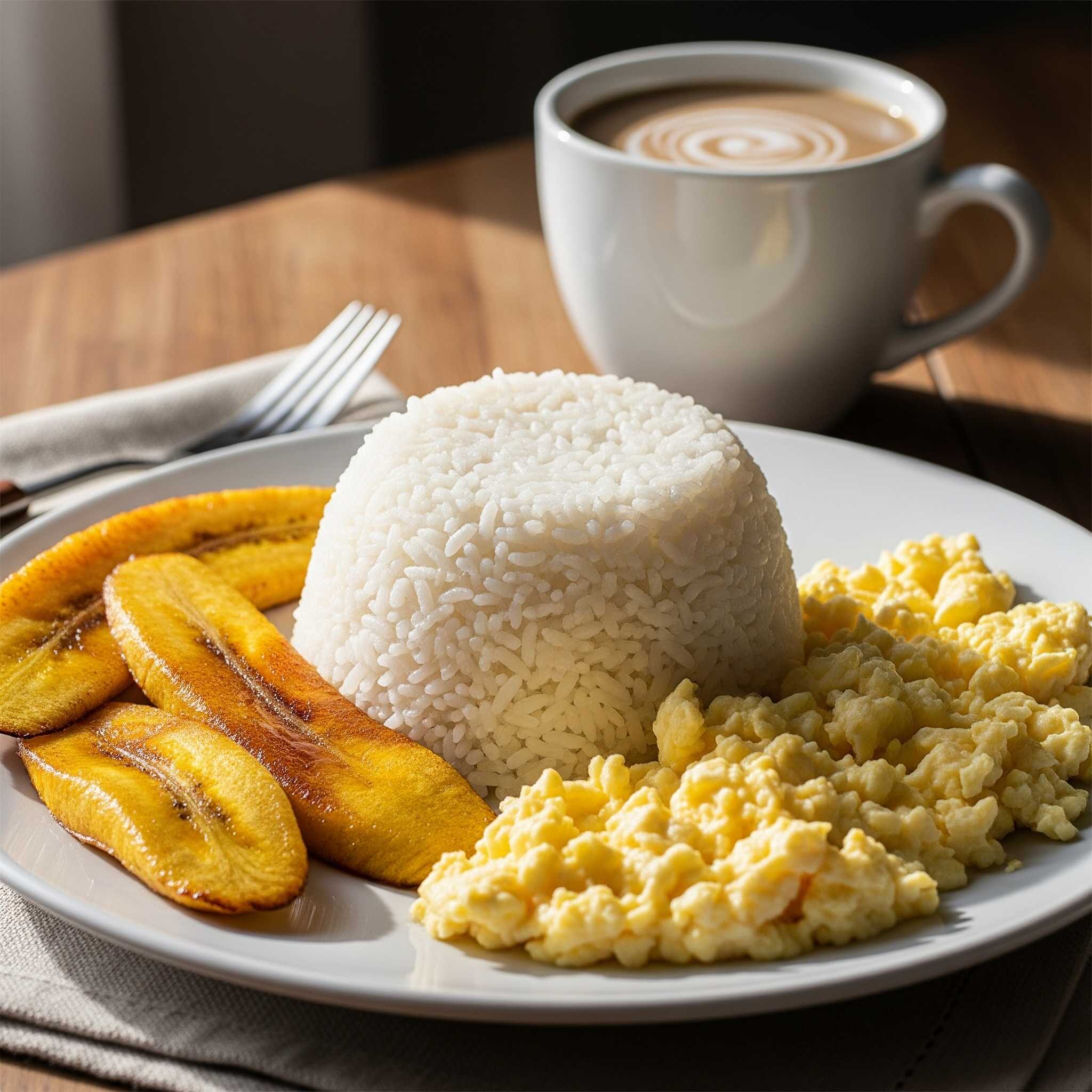 Arroz, huevos pericos, plátano maduro, café negro o en leche.