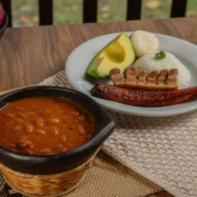 Platillo personal: arroz, frijoles rojos, chicharrón, huevo frito, ensalada de la casa y plátano maduro.