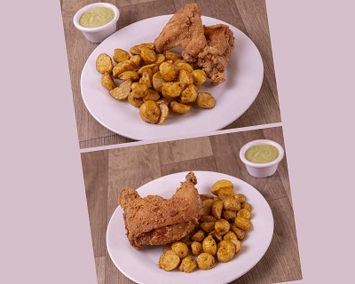 Pernil de pollo mediano con pechuga de pollo apanada mediana acompañados con papa criolla.
