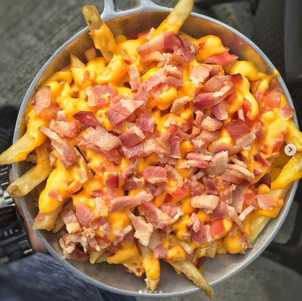 Papas a la francesa doradas, bañadas en queso Cheedar Americano. trocitos de tomate jugoso y tocineta ahumada.