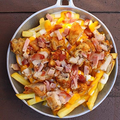Papas a la francesa crujientes con trozos de pollo apanado, tocineta ahumada y sour cream de la casa, bañadas en queso americano derretido.