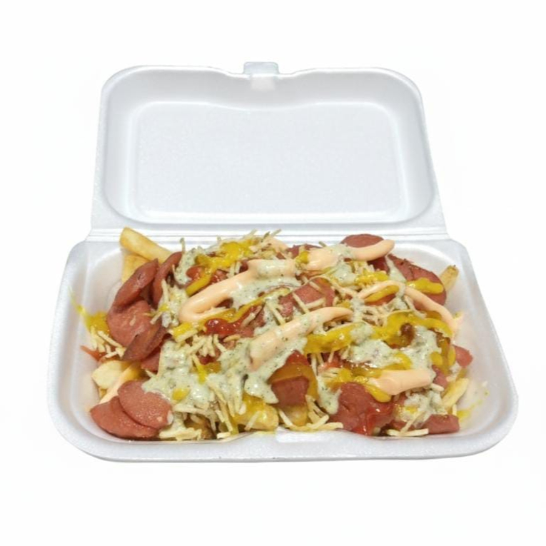 350 gramos de salchipapa (Papa francesa, salchicha tradicional, ripio y salsas.)