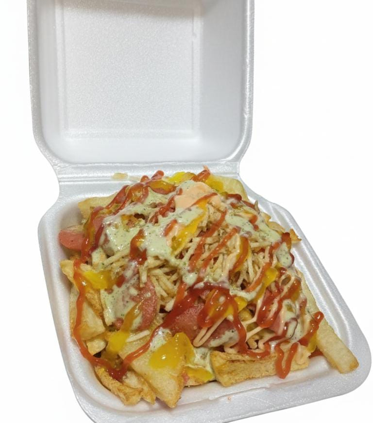 500gr de salchipapa (Papa francesa, salchicha tradicional ripio y salsas). El paquete completo para compartir entre amigos.