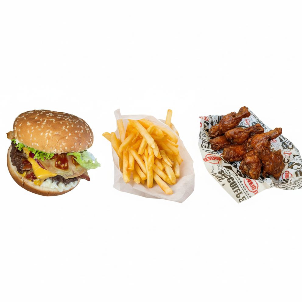 24 piezas de alitas bañadas en la salsa de tu elección BBQ, miel mostaza, honey BBQ, búfalo, BBQ picante + 2 porciones de papas francesa.