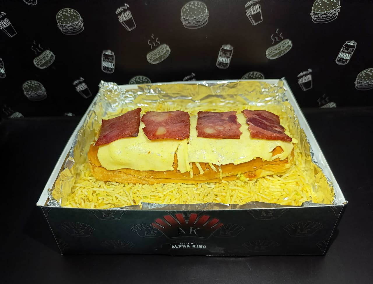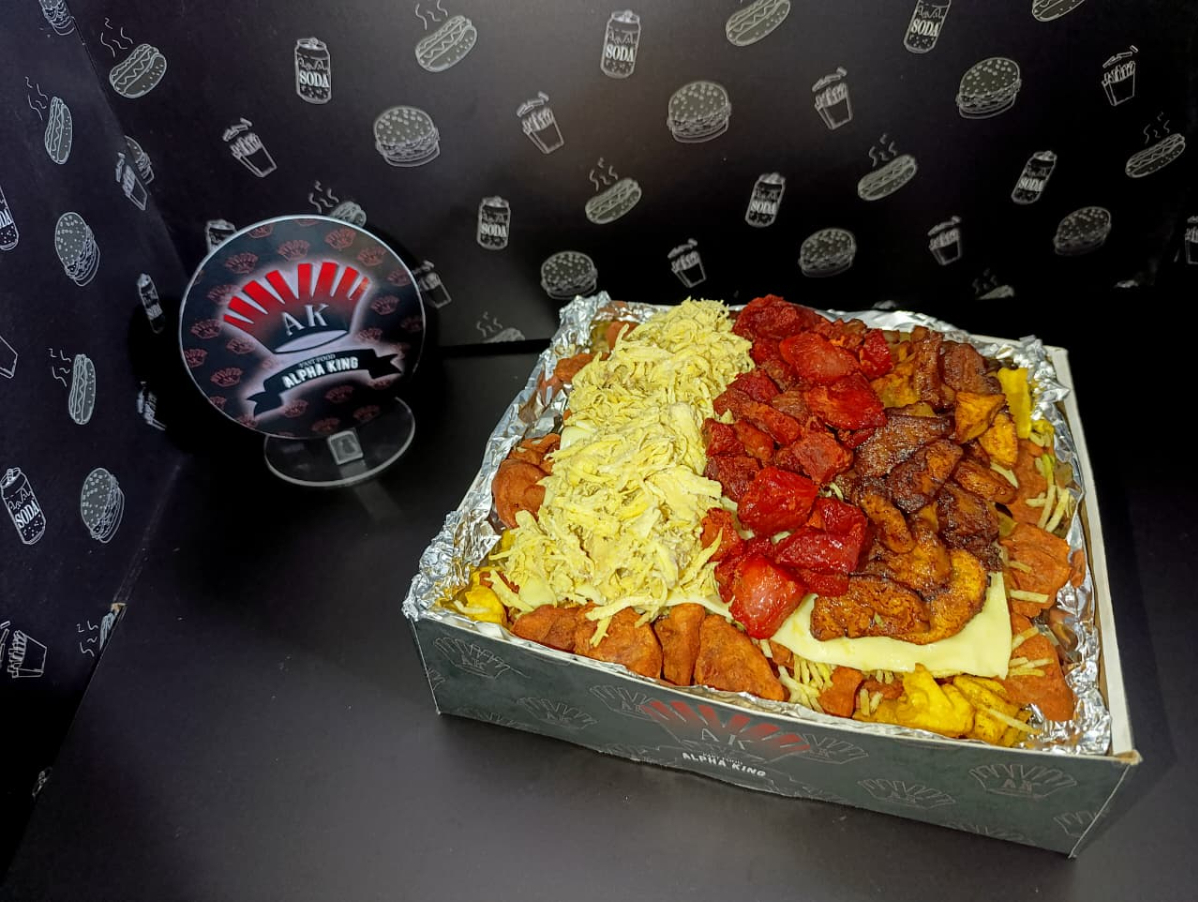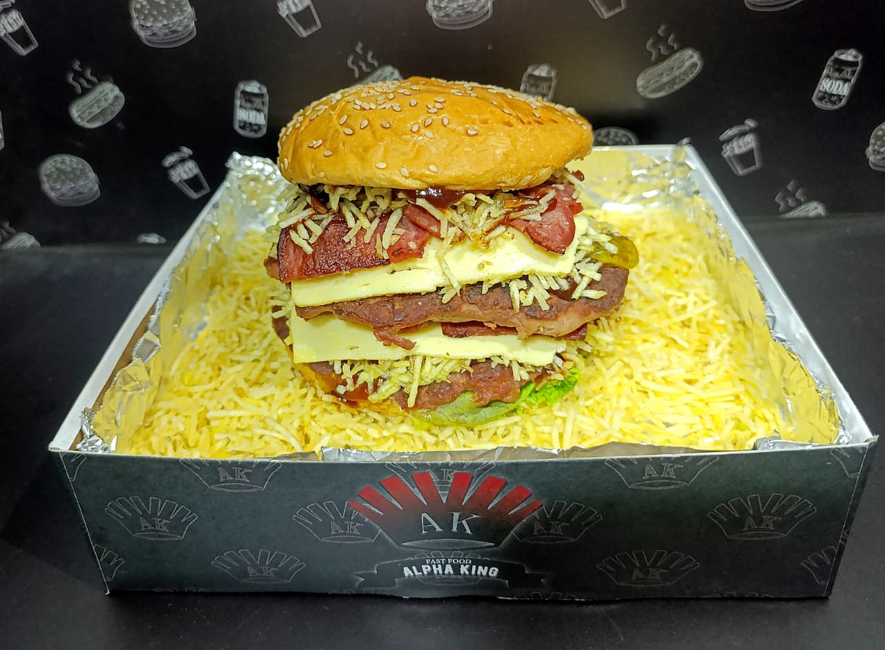 Pan brioche, carne, pollo desmechado, tocineta, lechuga, tomate, ripio,queso y salsas.