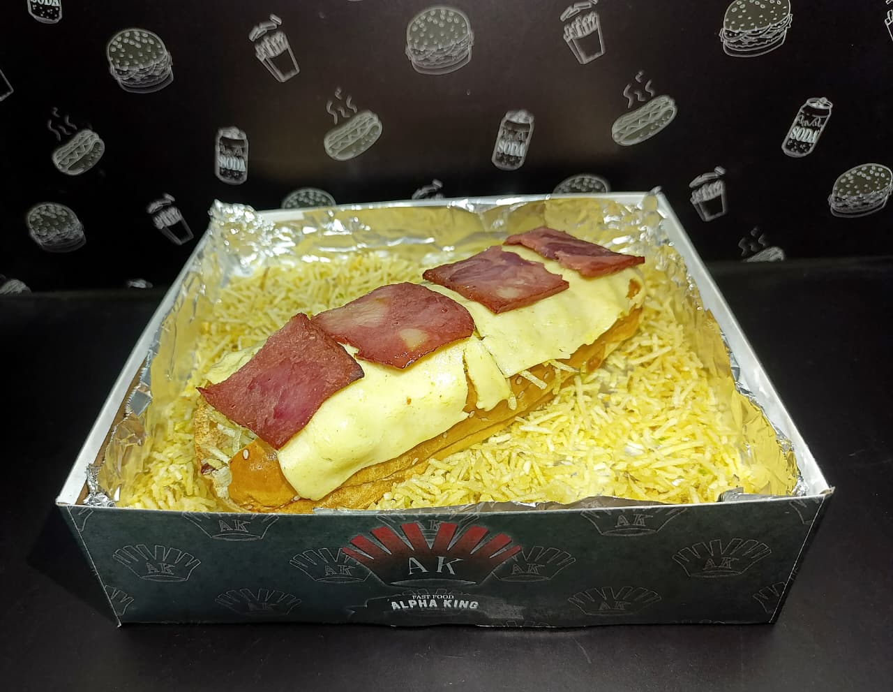Pan brioche, salchicha, ripio,queso, piña calada, tocineta y salsas