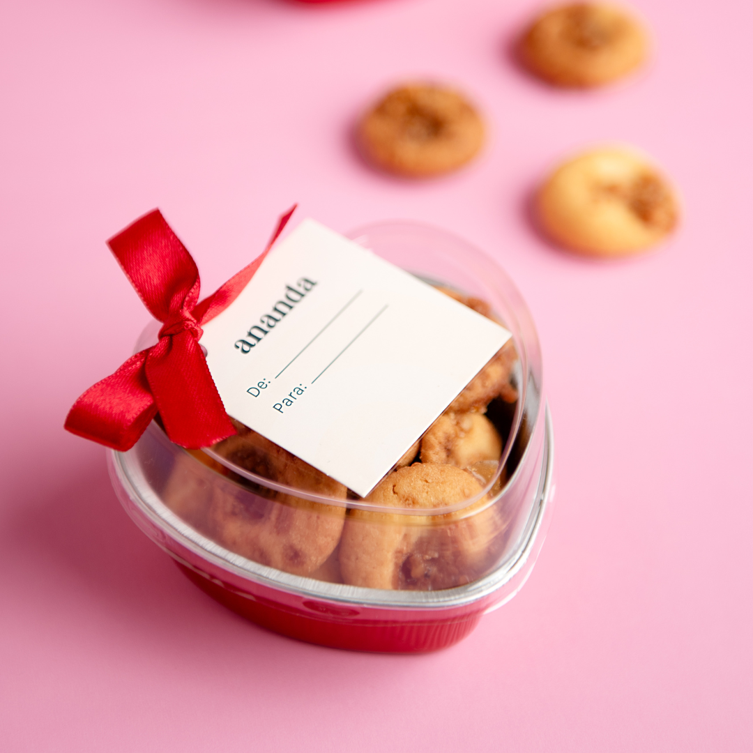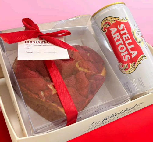 Galleta de Red Velvet en forma de corazón con un suave relleno de cheesecake. Presentación personal