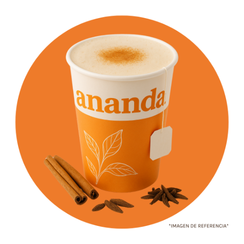 Infusión especiada de té chai con leche caliente, suave y reconfortante. ideal para una pausa cálida y aromática.