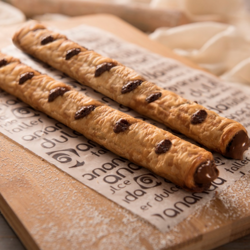 Palitos de hojaldre rellenos de chocolate con avellana tipo nutella.