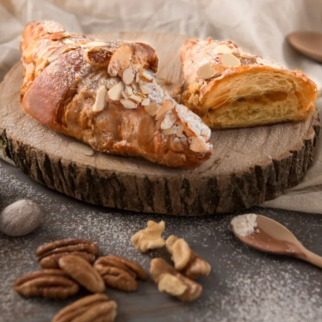 El croissant de almendras es un pan semihojaldrado relleno de crema de almendras y cubierto con almendras laminadas. su textura es crujiente y tiene un sabor a mantequilla.