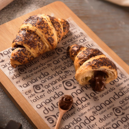 Su dorado intenso en su excelente hojaldrado enamora al tacto, mientras que, ya en boca, su agradable cremosidad, su tentador relleno de cacao con avellanas y su suave aroma crean adicción.