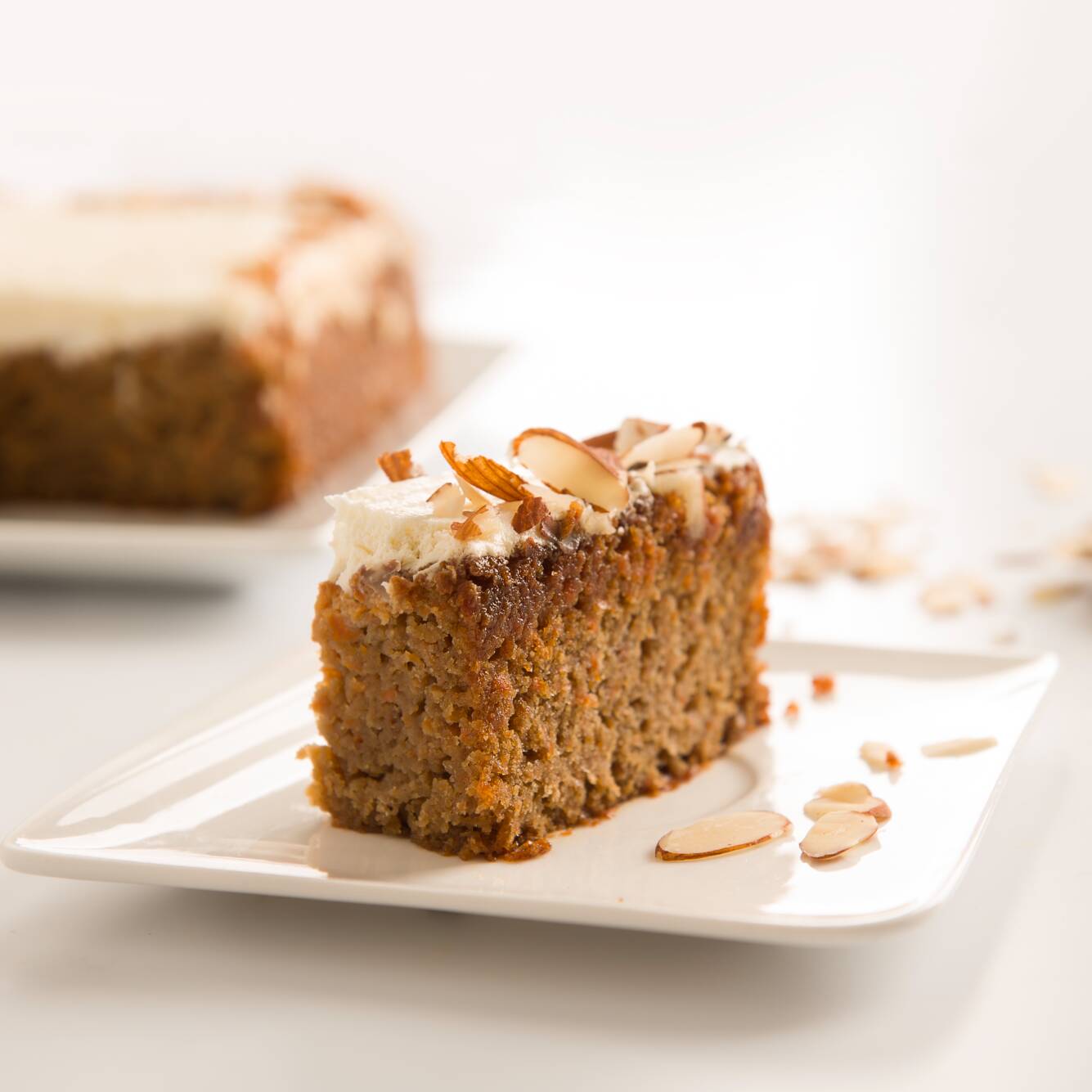 Torta de zanahoria 0% azúcar añadida, cubierta con un cremoso de queso y almendras.