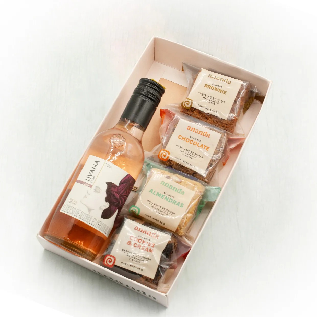 Este kit incluye un piccolo marca livana y cuatro brownies individuales surtidos, para disfrutar de momentos deliciosos y especiales. perfecto para regalar o darte un capricho.