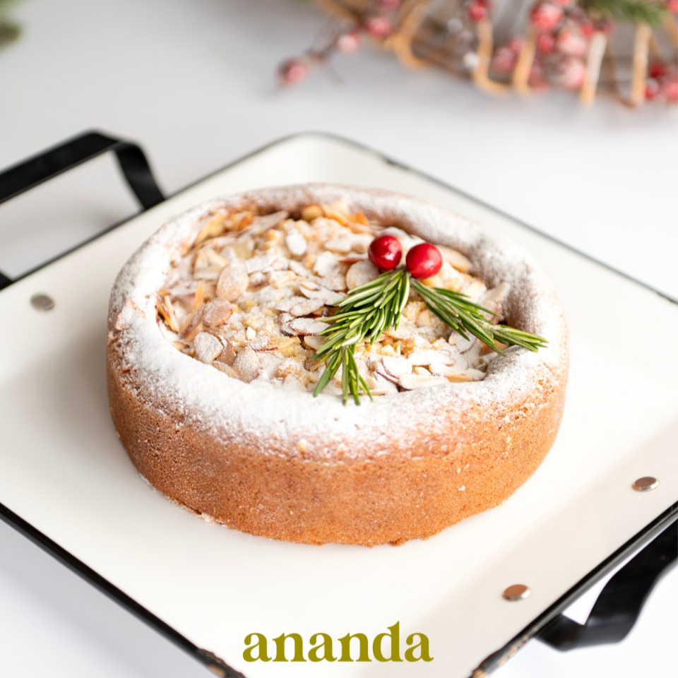 (8 porciones) Suave torta de vainilla con polvo de almendra, rellena con una delicada crema de croissant de almendra.