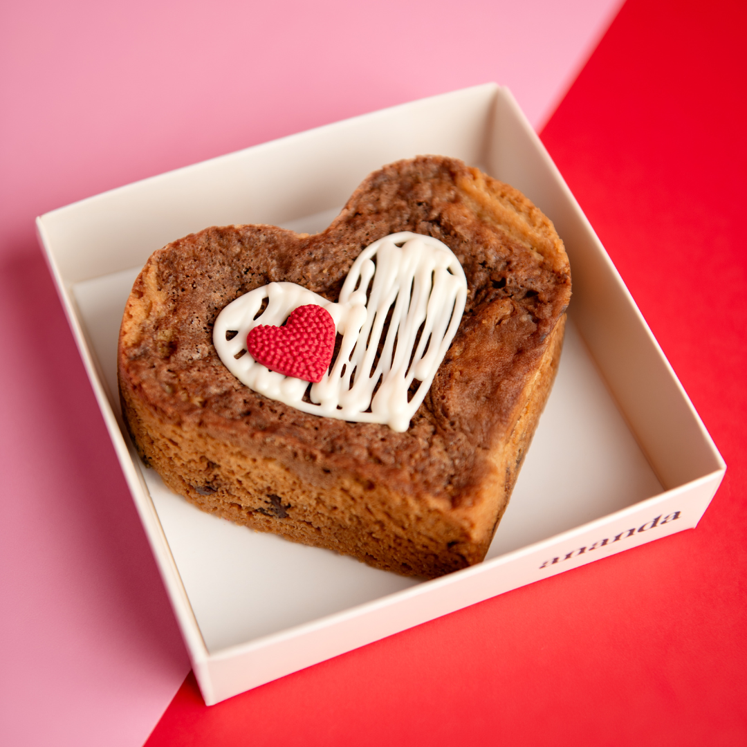 Galleta en forma de corazón con chips de chocolate y brownie melcochudo.