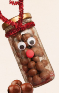 Grageas de chocolate rellenas de uvas pasas, decorada con estilo de reno.