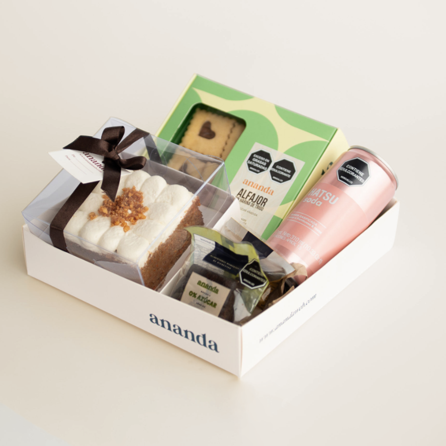 Caja especial con selección cero azúcar. Un regalo dulce, equilibrado y lleno de detalle. Este kit trae: 1 Torta Pequeña + 1 Caja de Alfajores cero azúcar y sin gluten + 2 Brownies cero azúcar + 1 Soda Hatsu