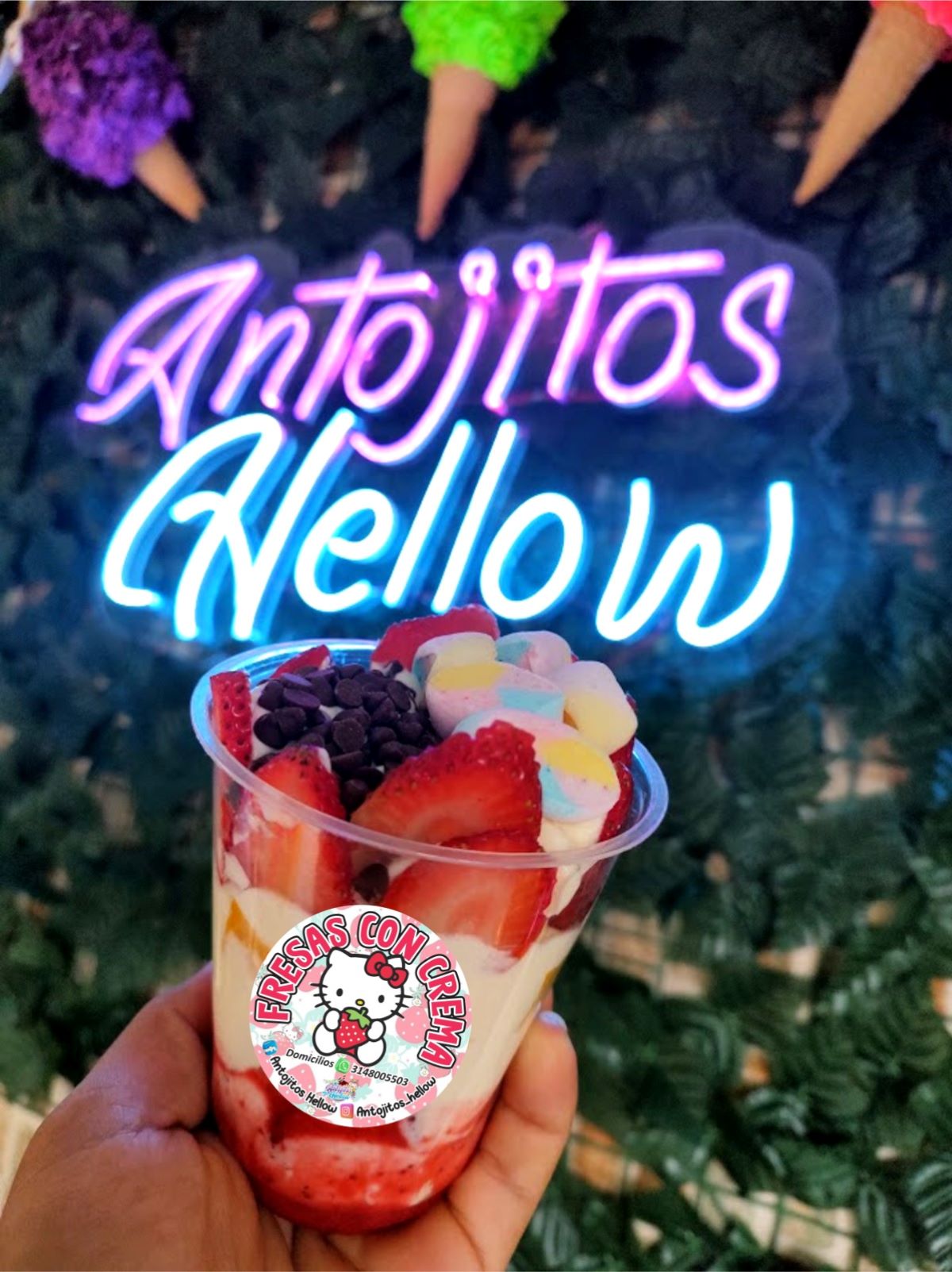 Deliciosas frutas y salsa acida combinadas con dos sabores de helado, leche condensada, galleta, chantillí y cereza.