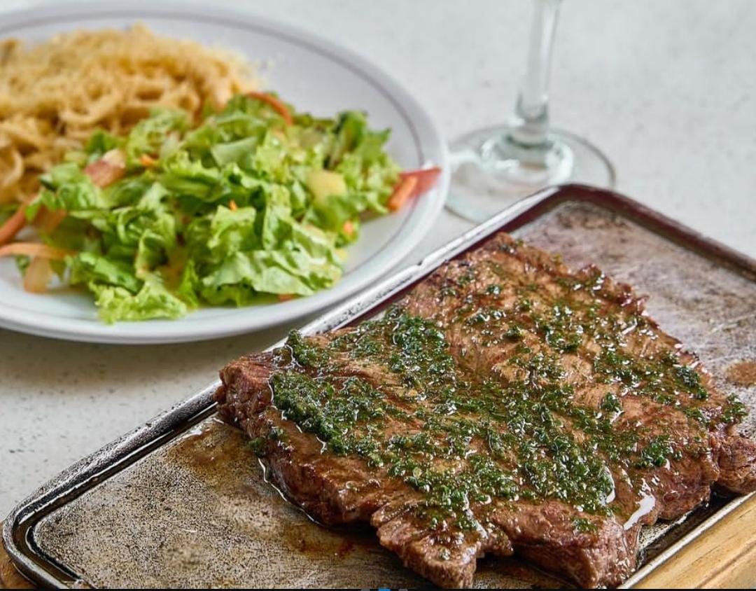 En salsa de champiñones con vino tinto, acompañado de ensalada (lechuga, tomate, pepino, zanahoria y vinagreta de miel mostaza), escoge entre papa al vapor con salsa de queso de la casa, pasta al burro o pasta alfredo.