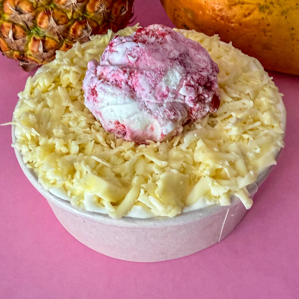 Mango, Papaya, Banano, Fresa y Piña, con una deliciosa salsa tres leches, acompañado de queso, leche condensada y 2 bolas de helado