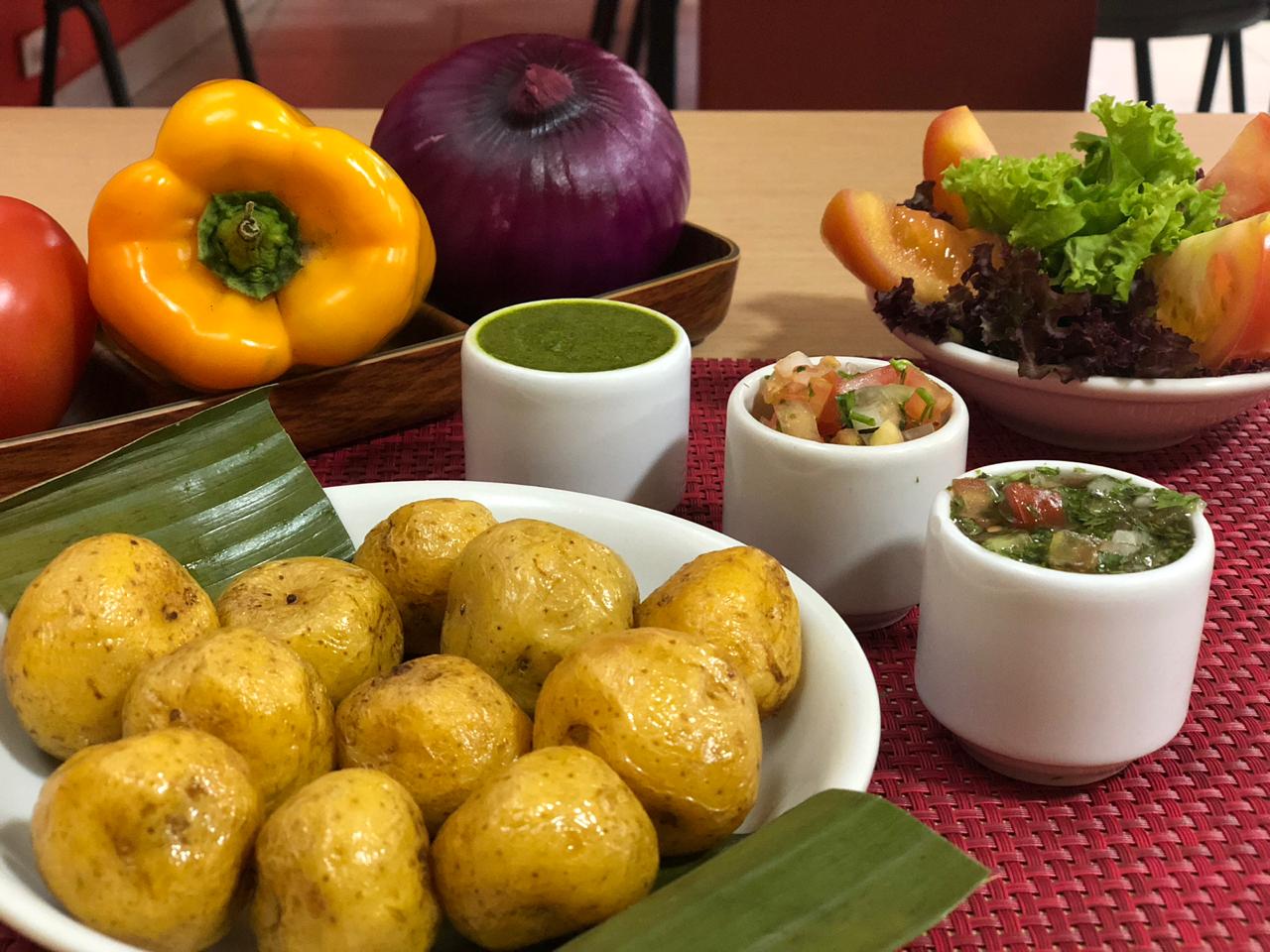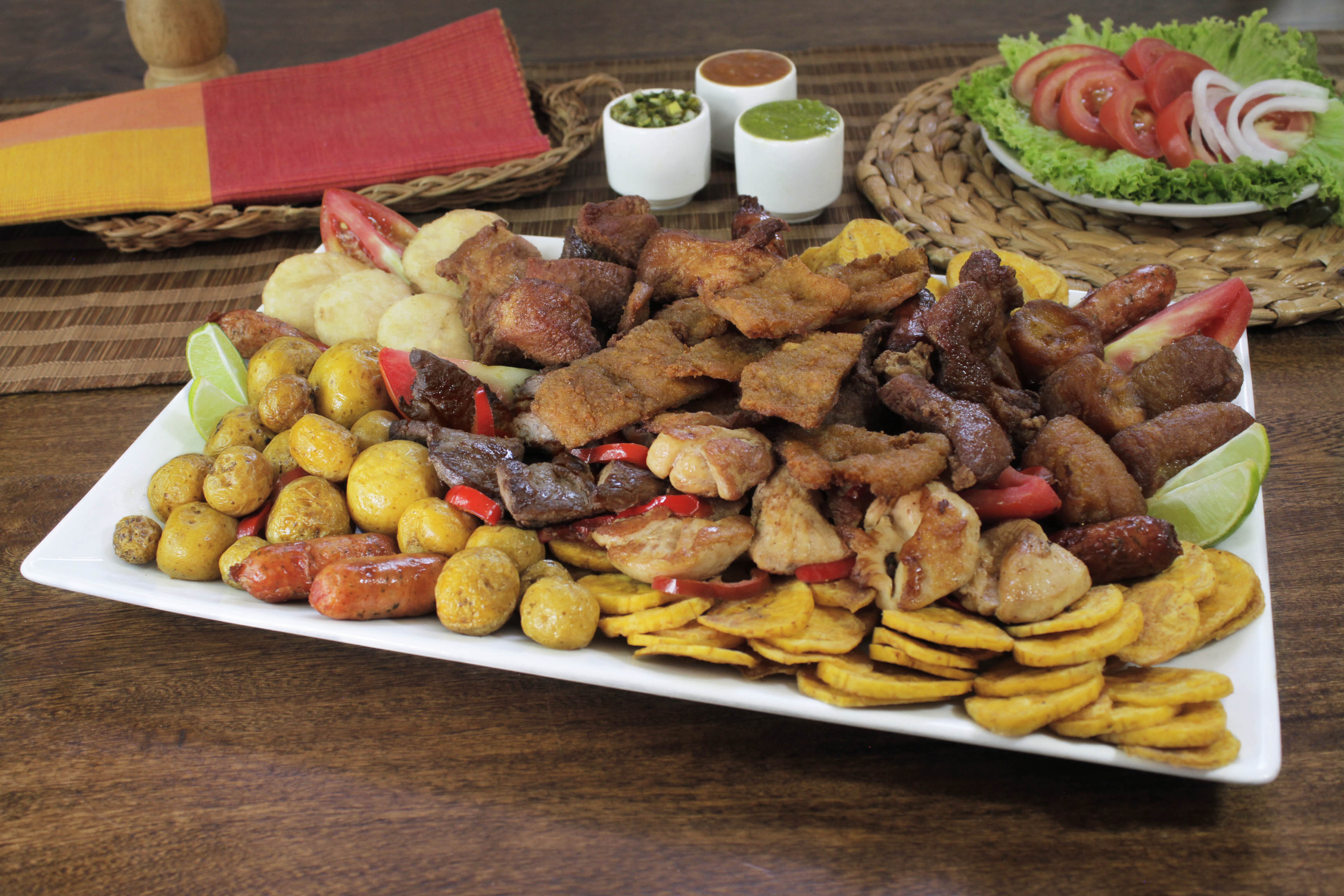 Trozos de chuleta de cerdo, lomo viche asado, costilla frita, filete de pollo, chorizos coctel, papa amarilla, maduro, arepas y moneditas de platano, para 3 personas.