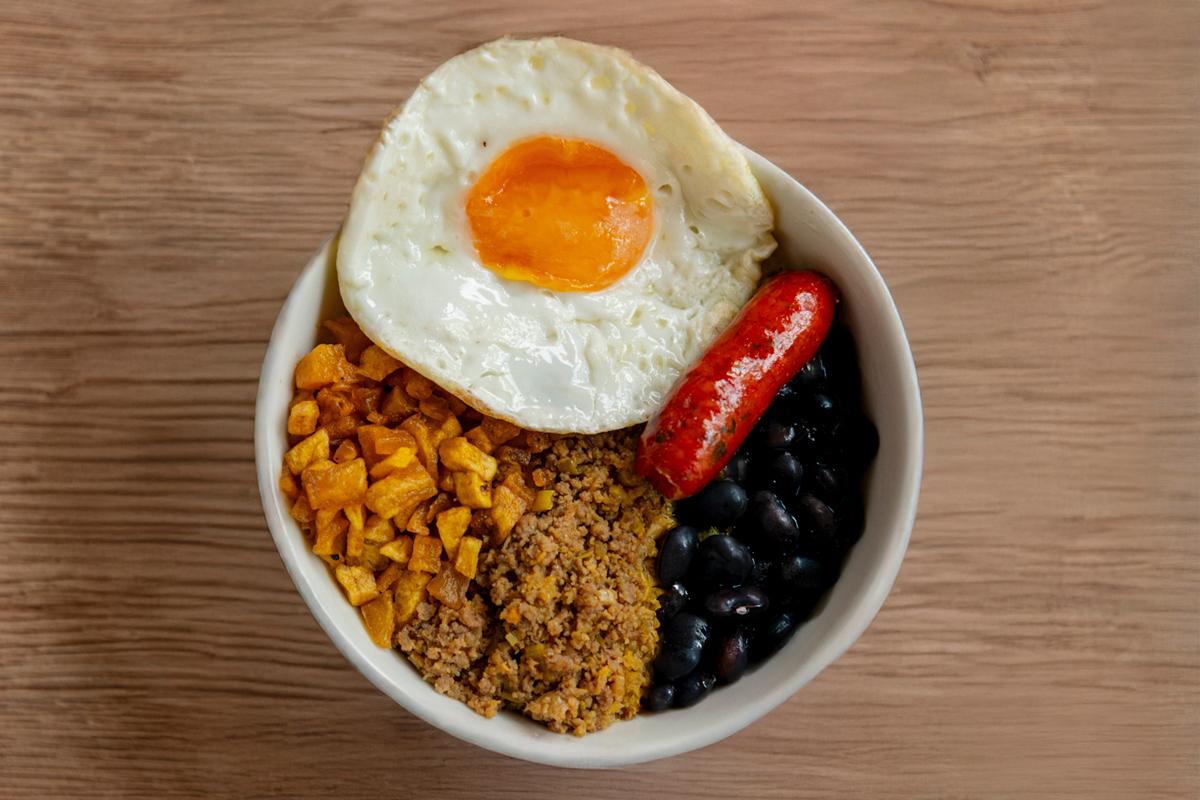 Bowl con carne molida de res, chorizo, huevo, madurito, frijoles negros y arroz.