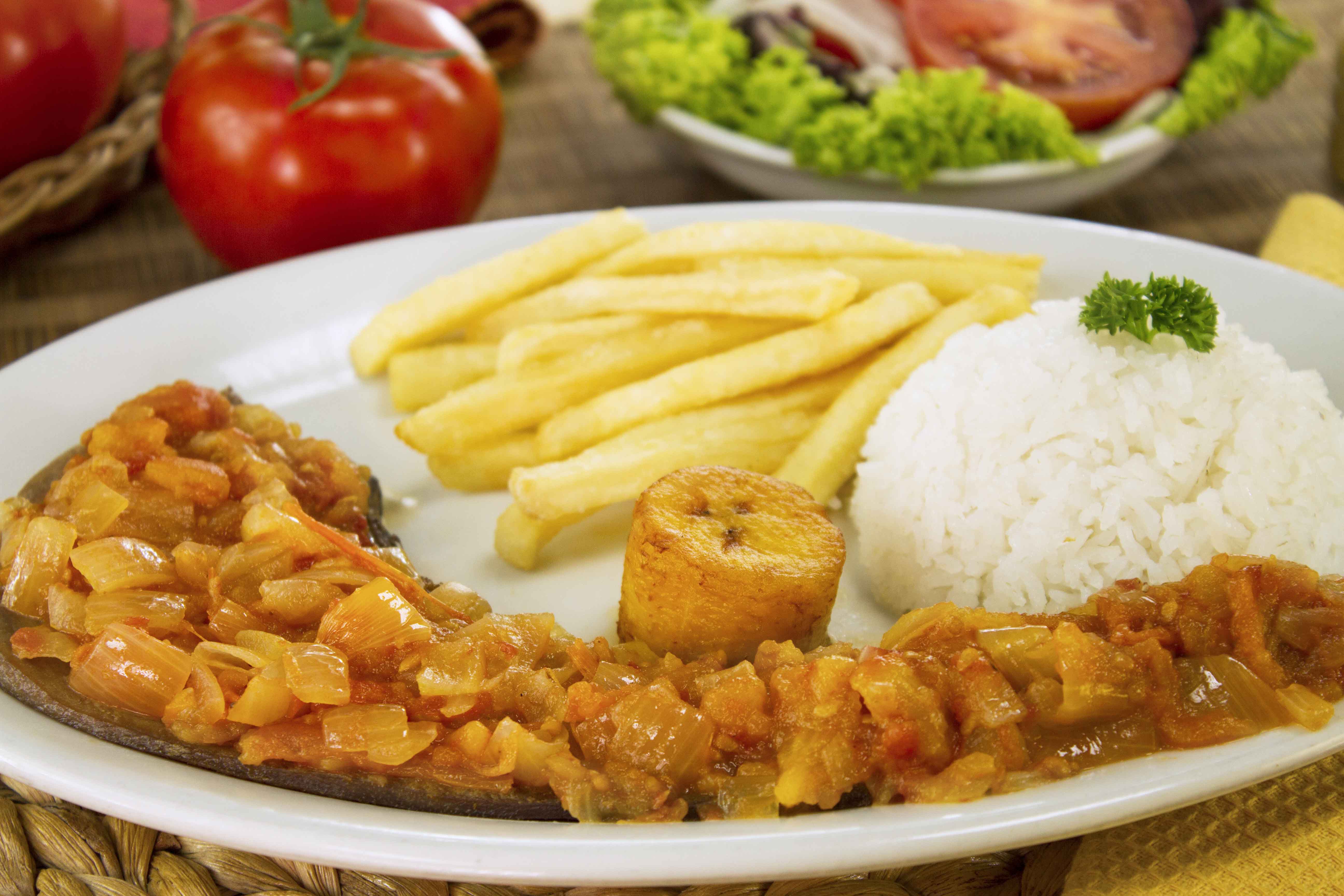Sobrebarriga de res en salsa criolla, acompañada de arroz, papa a la criolla, ensalada y arepa. La cantidad de los acompañamientos irá de acuerdo al tamaño que selecciones.