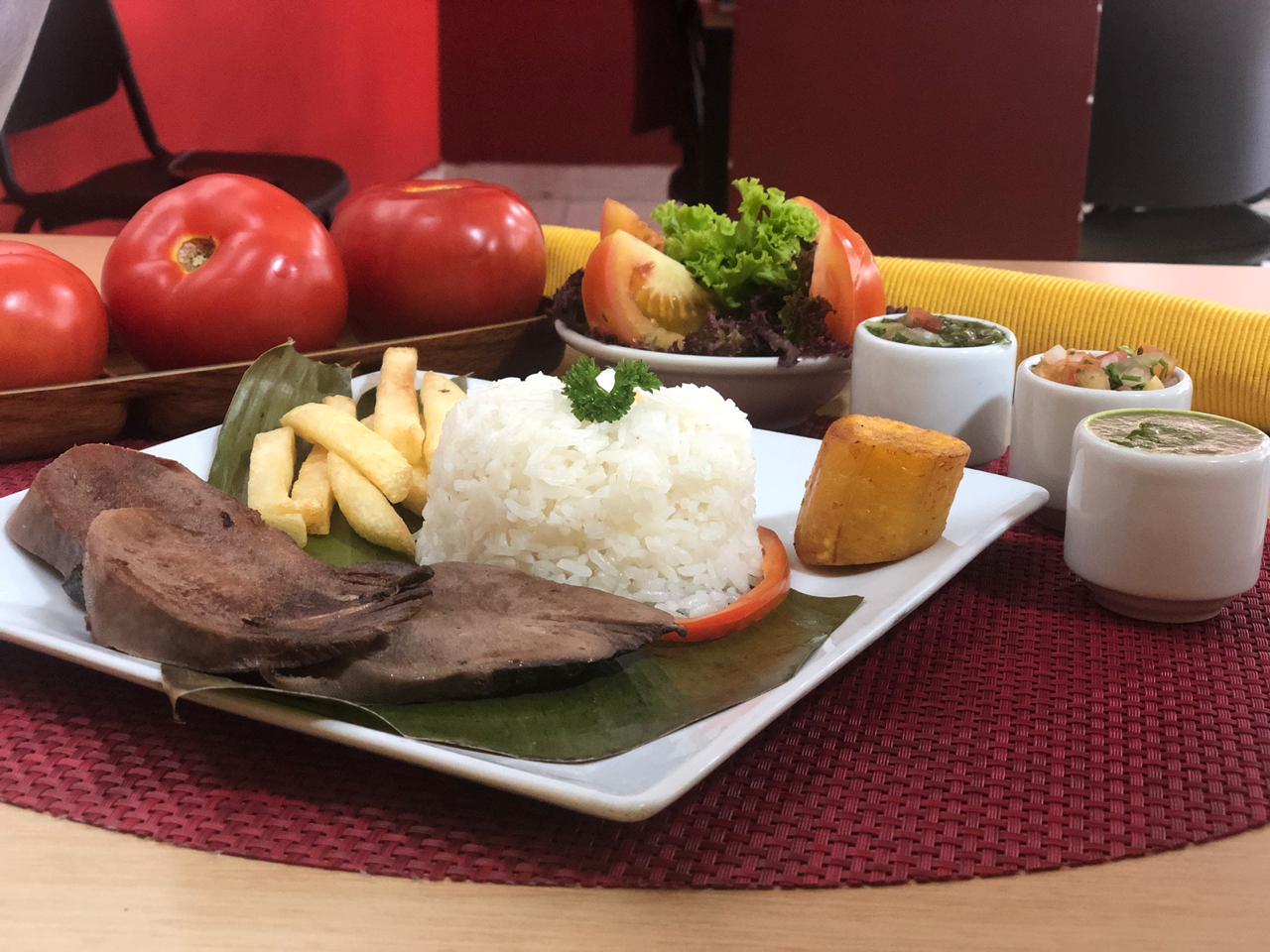 Lengua de res asada a la plancha, acompañada de arroz, papa francesa, ensalada y arepa. La cantidad de los acompañamientos irá de acuerdo al tamaño que selecciones.