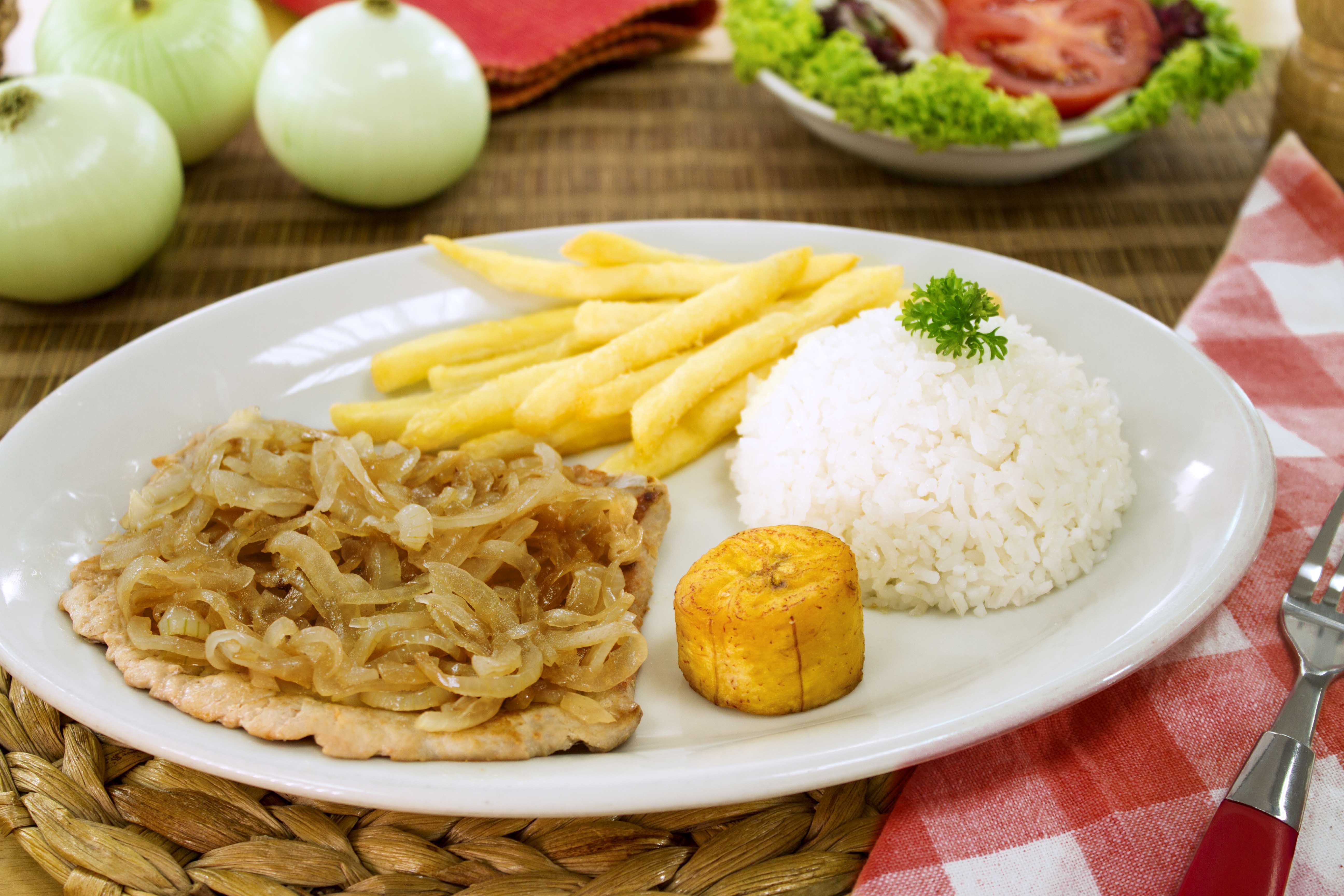 Lomo de cerdo asado a la plancha con cebolla acompañado de arroz, papa francesa, ensalada y maduro. La cantidad de los acompañamientos irá de acuerdo al tamaño que selecciones.
