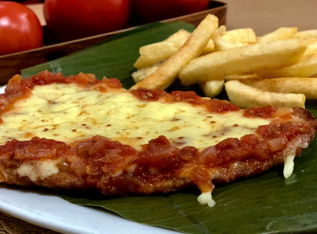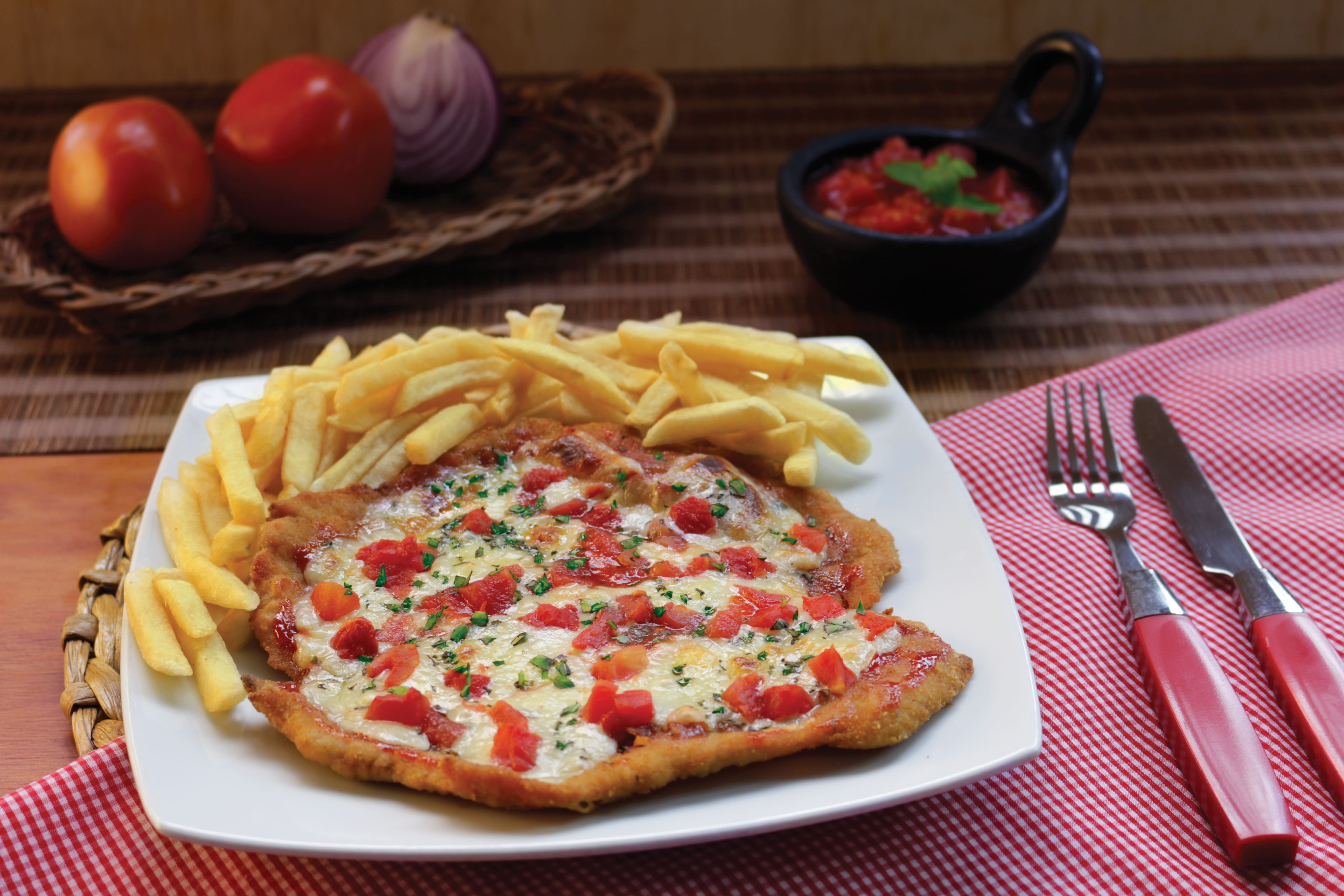 Chuleta gratinada con mozzarella, salsa criolla y papa francesa. Escoge el tipo de carne.