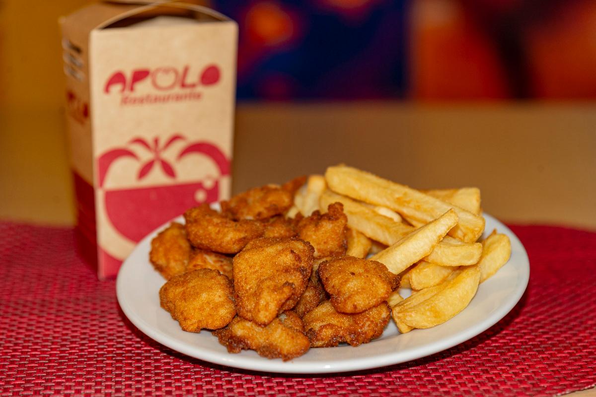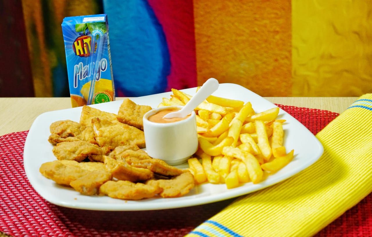Trocitos de chuleta acompañados con papas a la francesa y jugo Hit.