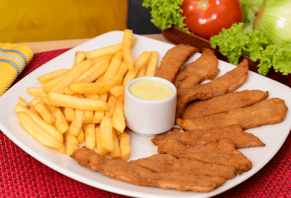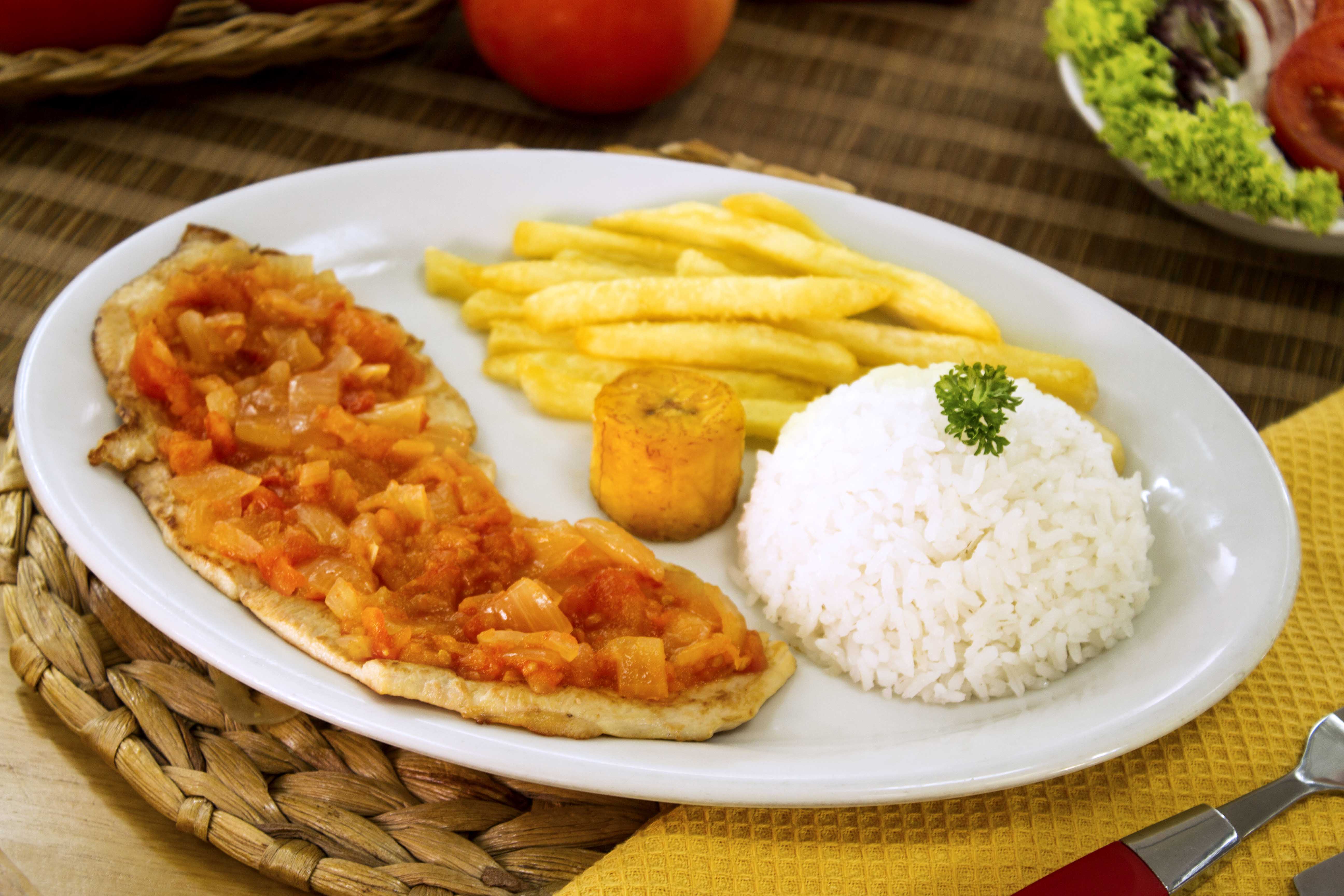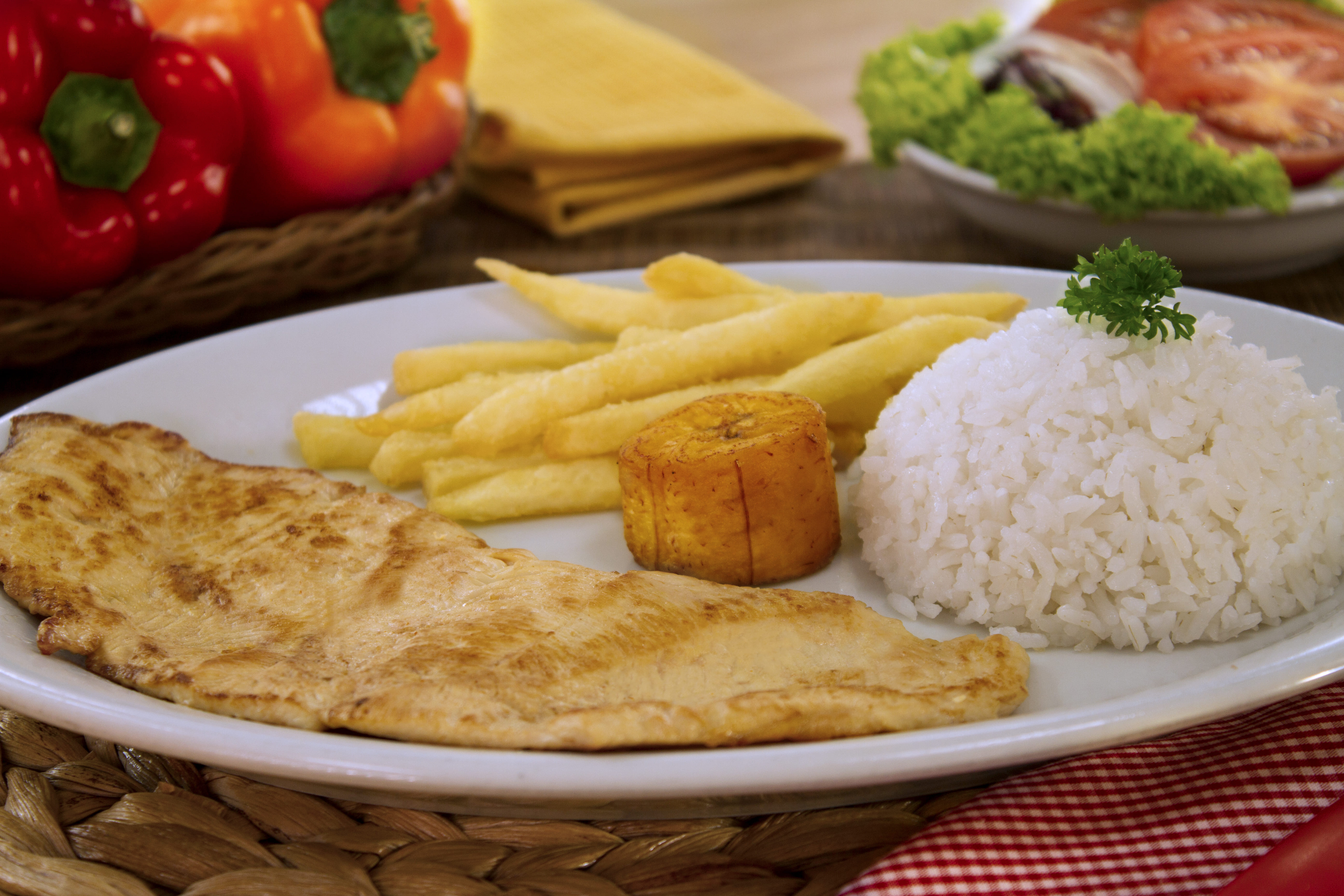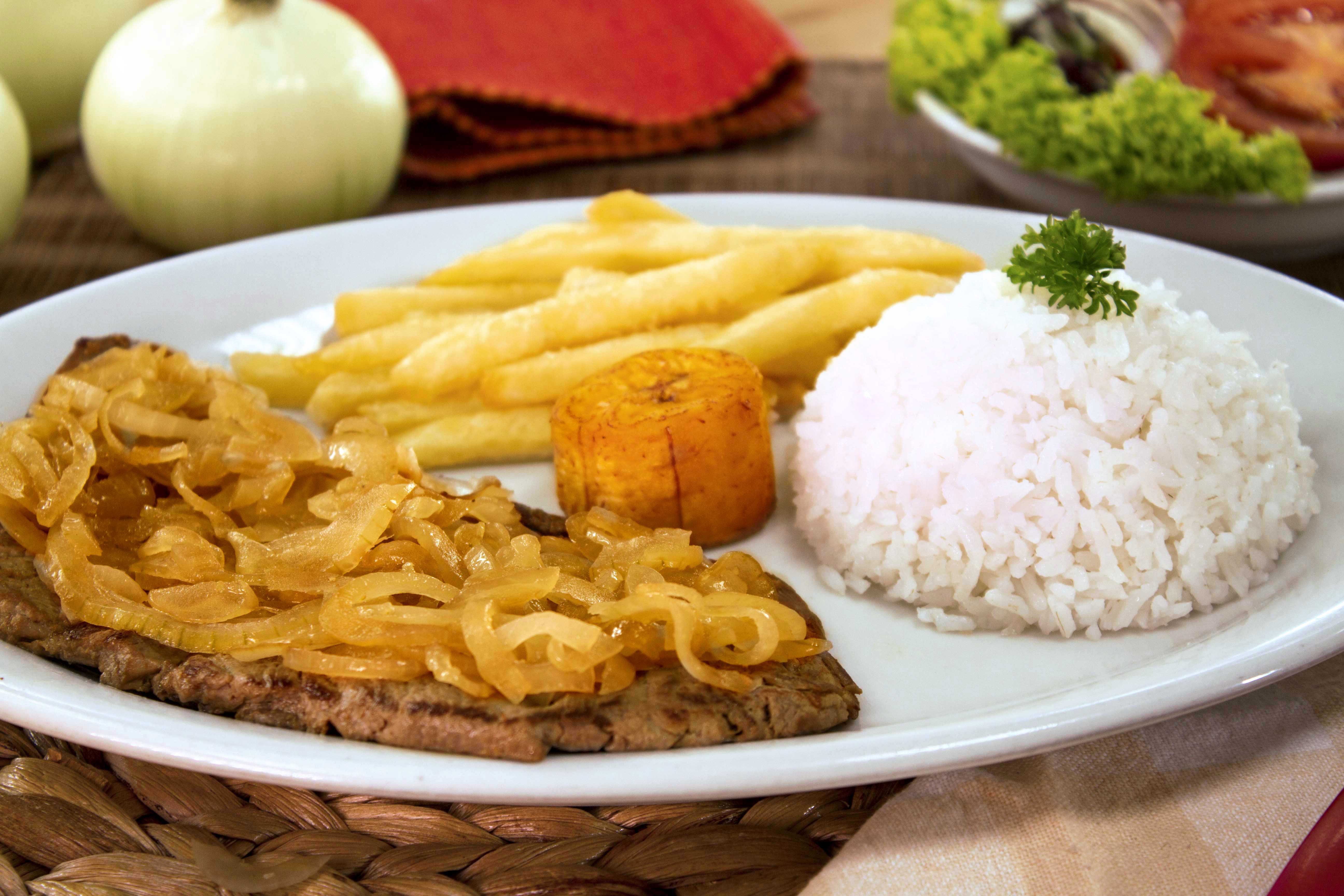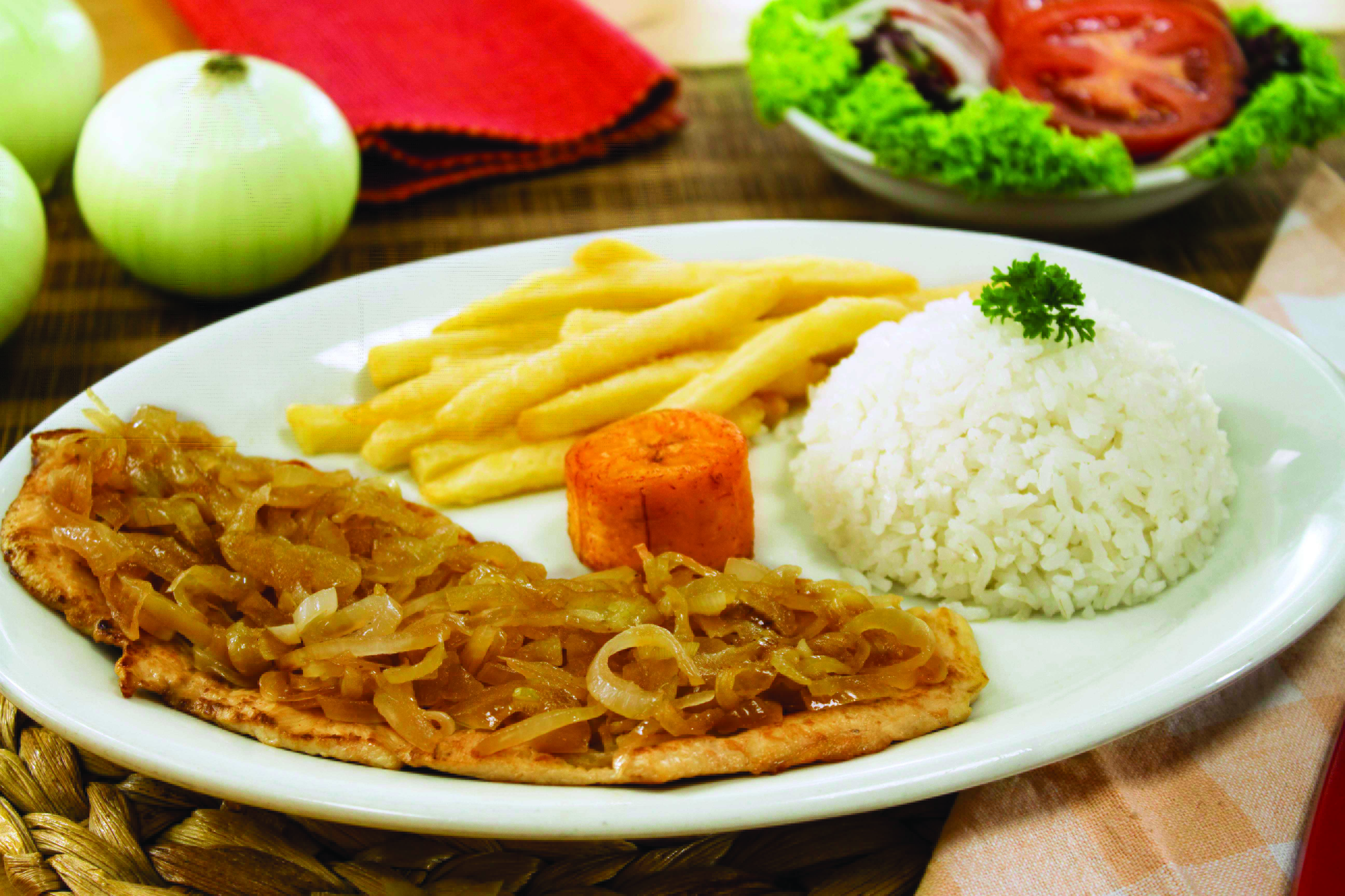 Filete de pollo asado a la plancha con cebolla acompañado de arroz, papa francesa, ensalada y maduro. La cantidad de los acompañamientos irá de acuerdo al tamaño que selecciones.