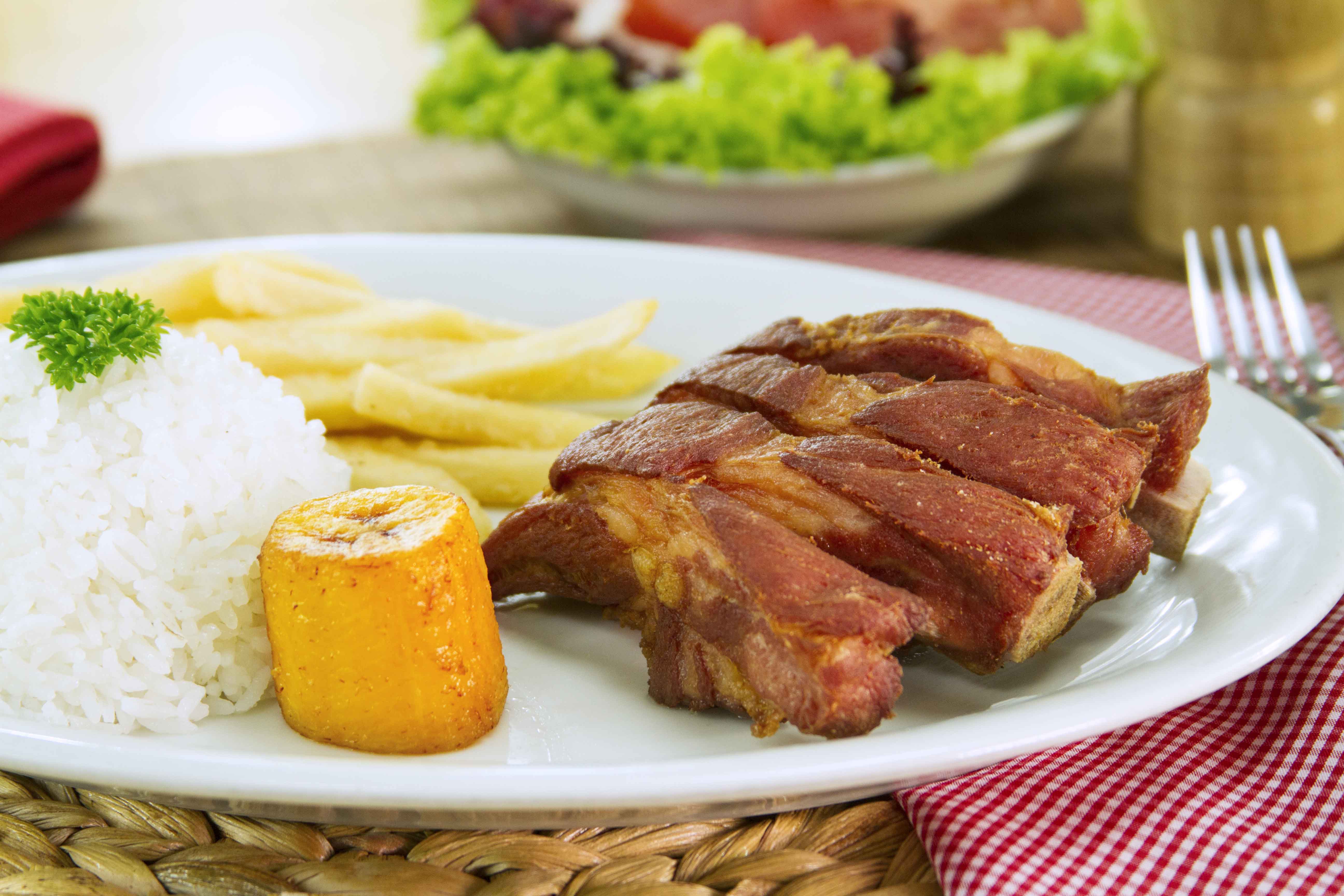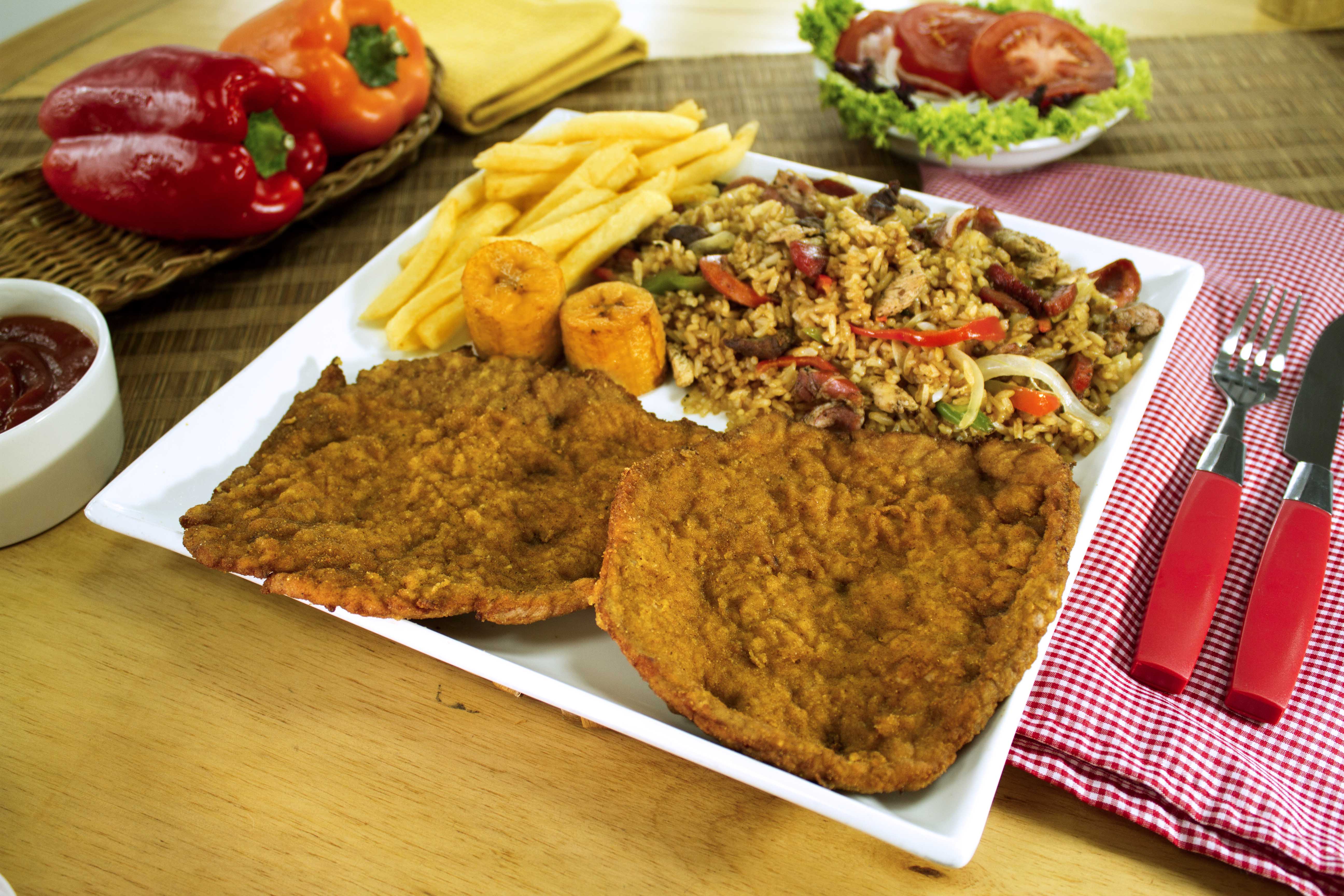 Costilla de cerdo frita, papa francesa, arroz, ensalada y maduro. La cantidad de los acompañamientos irá de acuerdo al tamaño que selecciones.