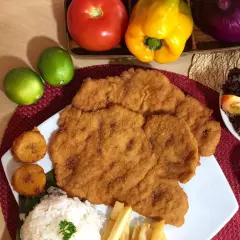 Chuleta gratinada con mozzarella, maduro y papa francesa. Escoge el tipo de carne.
