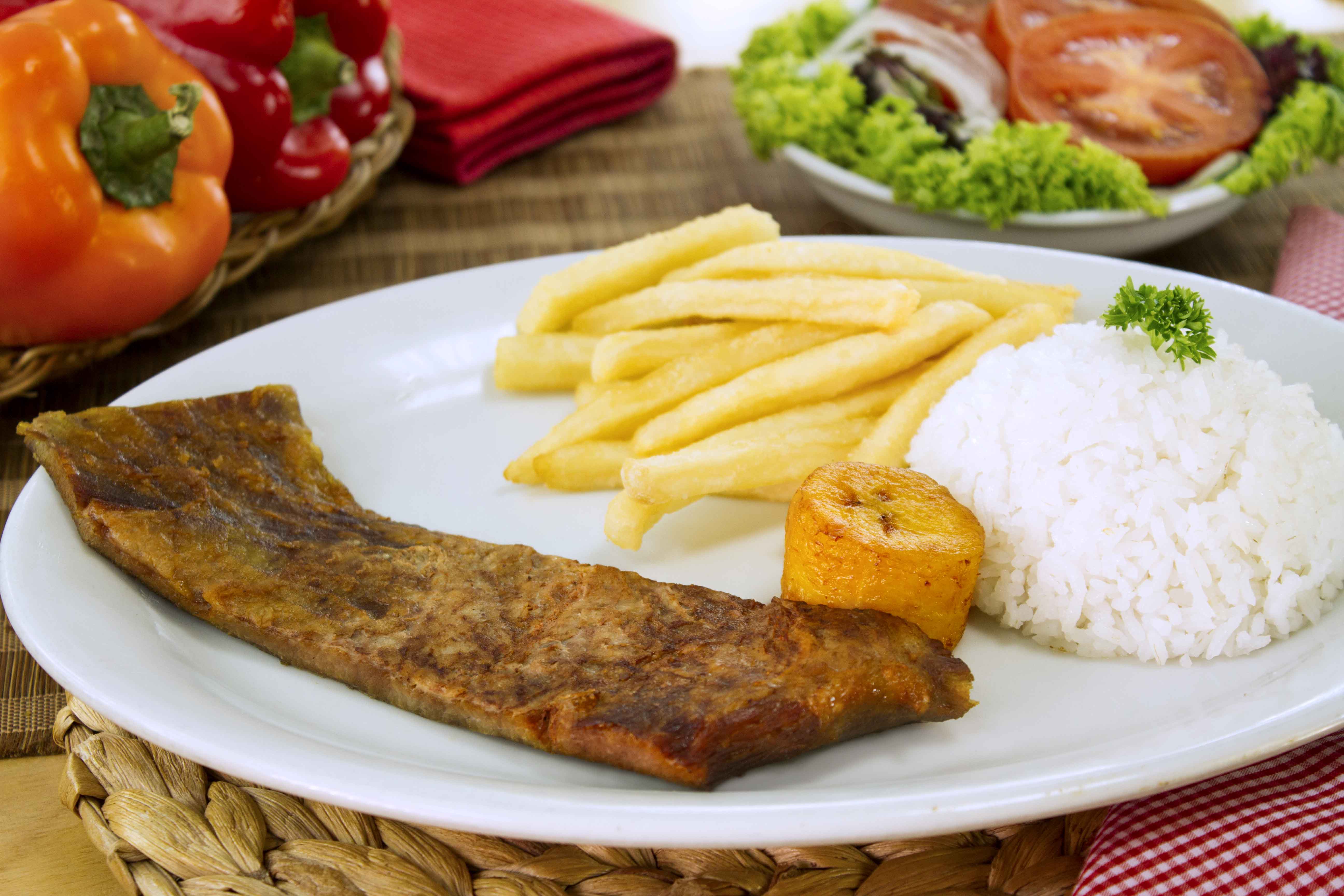 Lomo viche de res, acompañado de arroz, papa francesa, ensalada y maduro. La cantidad de los acompañamientos irá de acuerdo al tamaño que selecciones.